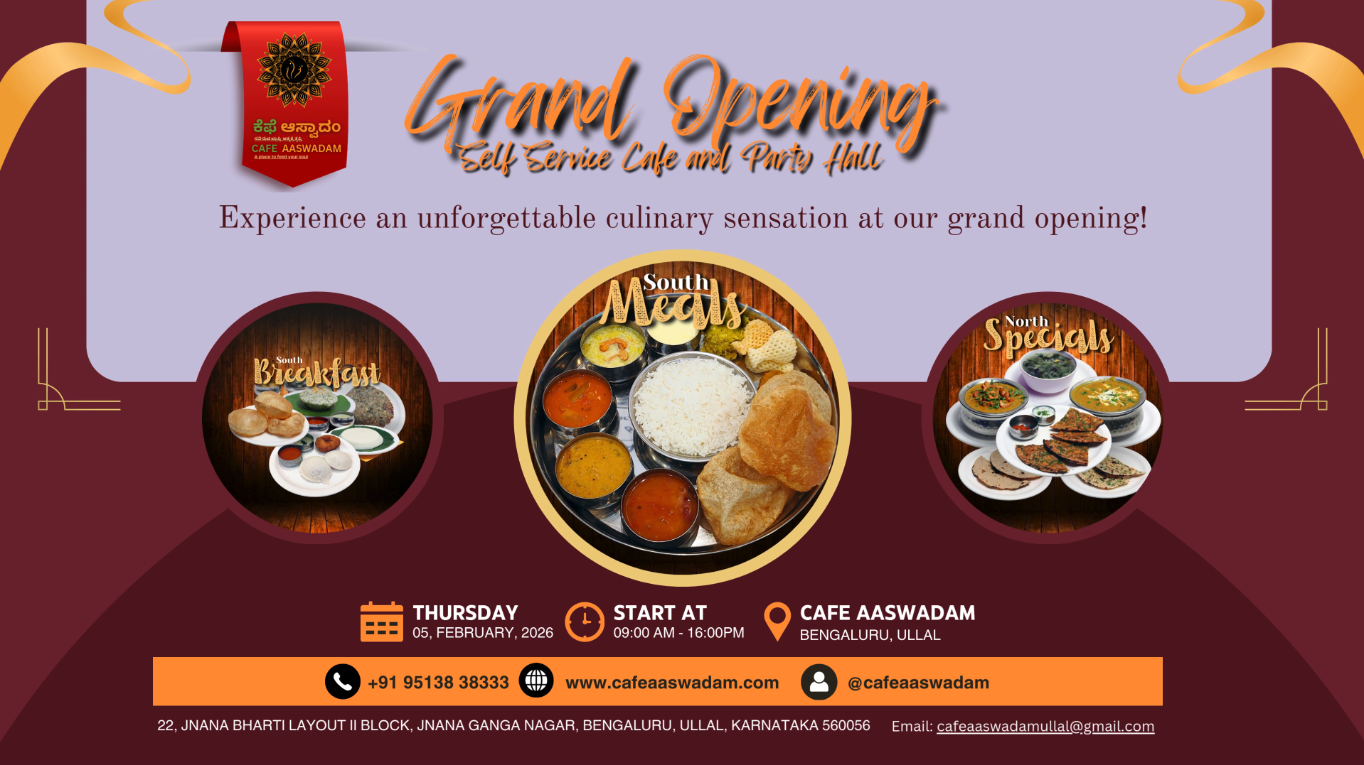 “Café Aaswadam” is “A place to feed your soul” where taste meets tradition and every meal is prepared to please your soul. With a passion for good food and warm hospitality, we serve a wide variety of South Indian, North Indian, and Chinese dishes, along with refreshing beverages and delicious snacks.